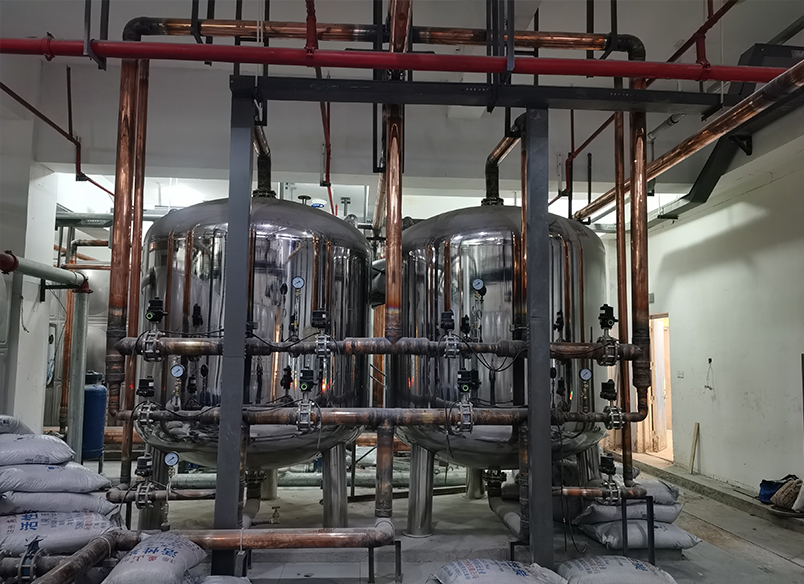 石英砂過濾器:又叫多介質過濾器(濾床), 既采用兩種以上的介質作為濾層的介質過濾器,在 工業循環水處理系統中,用以去除污水中雜質、吸附油等,使水質符合循環使用的要求。過濾的作 用,主要是去除水中的懸浮或膠態雜質,特別是能有效地去除沉淀技術不能去除的微小粒子和細菌 等,BOD5和COD等也有某種程度的去除效果;去除水中的泥砂、懸浮物、膠體等雜質和藻類等生 物,降低對反滲透膜元件的機械損傷及污染。